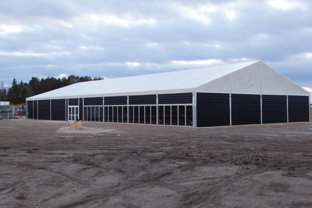 Vi producerar hallar för olika ändamål och storlekar – osolerade eller isolerade. Konstruktionen består av prefabricerade sektioner i aluminium eller stål med tak- och väggbeklädnad i Pvc, fasadplåt eller sandwich. Oisolerade hallar kräver normalt inget betongfundament och kan monteras direkt på ett hårdgjort underlag som asfalt eller grusplan. Dimensionerade för snözoner upp till 4,5 kN/m² med leveranstid på cirka 6–8 veckor.